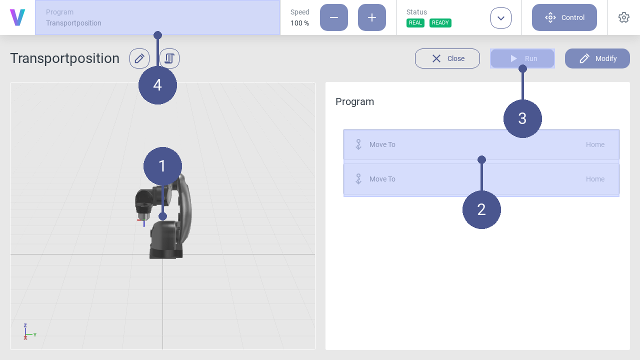The new program can be loaded and executed in the overview screen. Before running your program on a real robot, it’s possible to simulate your path with the digital twin first. To check and switch the mode, have a look on the status screen. While running the program a digital twin of the robot is shown.