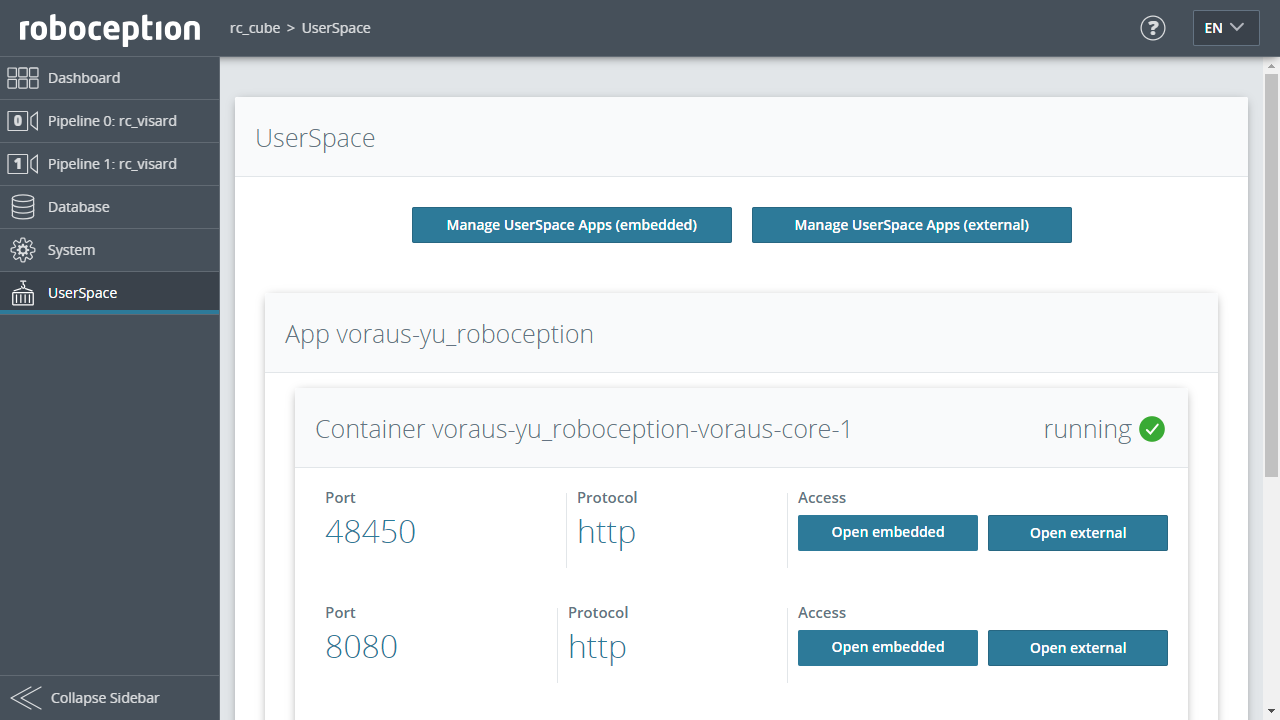 Once the voraus.core is configured inside the rc_cube’s Portainer UI, you can access the voraus.operator by navigating to the UserSpace section and clicking either on the Open embedded or Open external button of the voraus.core app, like shown in (Fig. 56). Changing the port of the voraus.operator is described in the Installation chapter of your voraus.core documentation (see voraus.core).