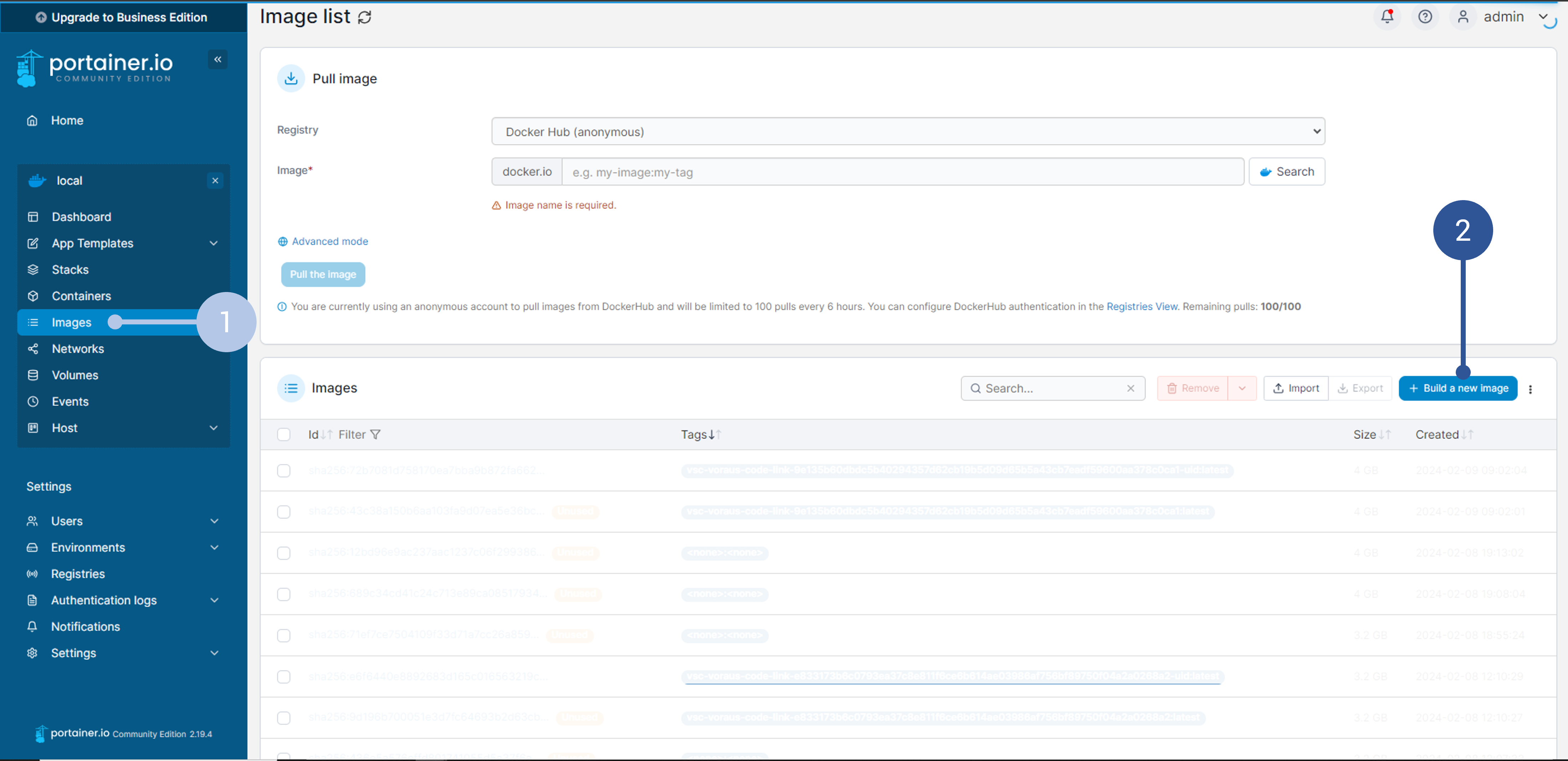 It is possible to modify the Docker image of the voraus.core directly within Portainer’s UI. Click on Images in the menu (Fig. 9/➊) and select Build a new image (Fig. 9/➋).