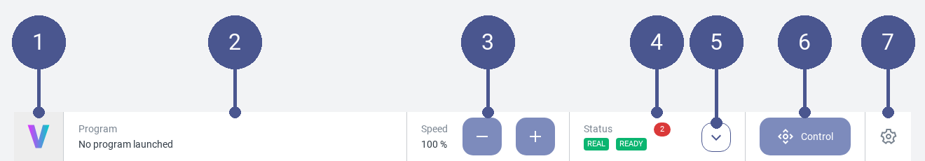 Speed - Adapt the speed of the robot. The maximum value of 100 % the upper limit set in the settings / commands. |