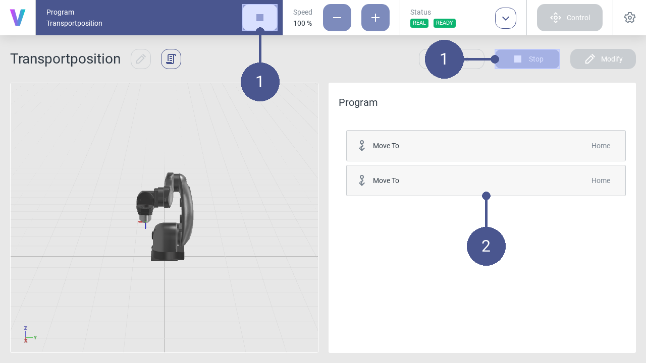 The new program can be loaded and executed in the overview screen. Before running your program on a real robot, it’s possible to simulate your path with the digital twin first. To check and switch the mode, have a look on the status screen. While running the program a digital twin of the robot is shown.